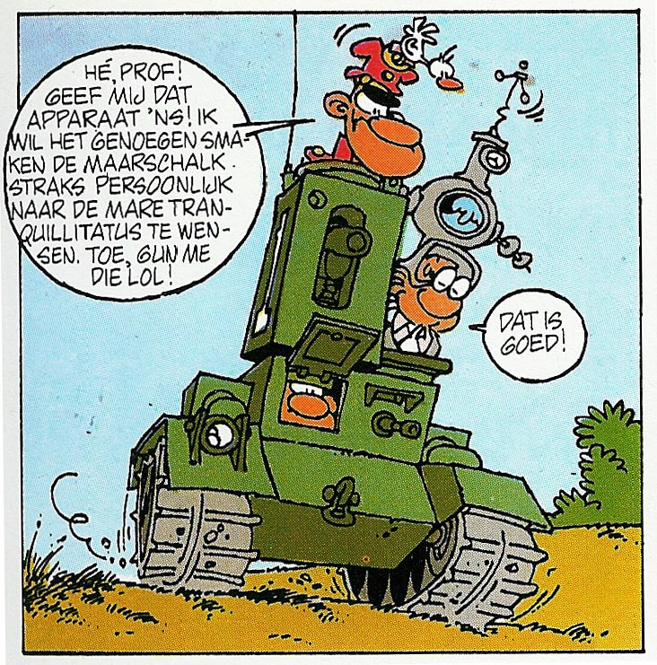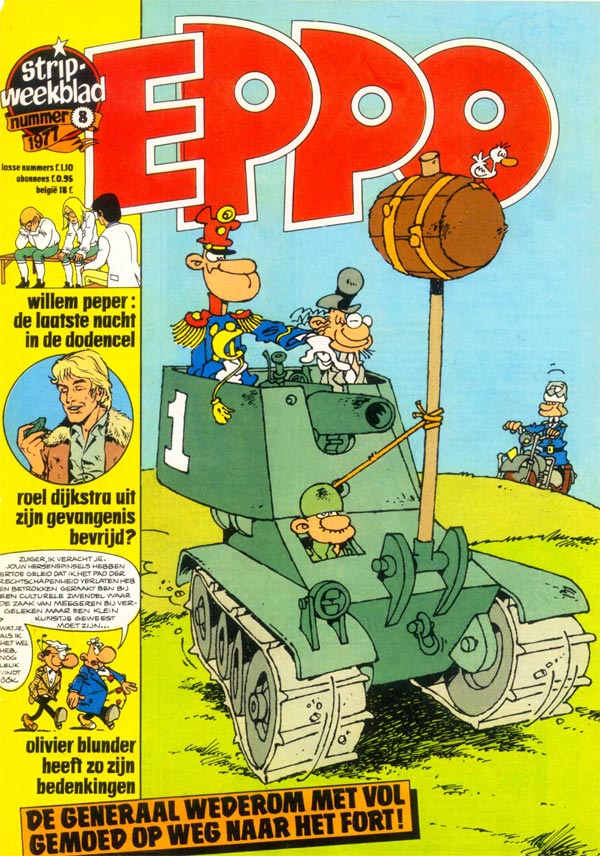 Back in the Netherlands, De Smet eventually settled in the town of Bergen. Jan Kruis advised him to show his comics to Hetty Hagebeuk, chief editor of comic magazine Pep. She instantly accepted his new version about a concept of a power hungry general. In fact, Hagebeuk ordered eleven stories right away! De Smet was taken by surprise, as the insecure artist was not certain if his creation could last that long. But 'De Generaal' was an instant hit from the first appearance in Pep issue #29 (10-16 July 1971). His creator quickly found a successful formula. Each episode was constructed around the same gimmick. The protagonist, simply known as "The General", wants to seize power, represented by "The Fort" occupied by "The Marshal". His army consists of one single unmotivated soldier and a professor. His headquarters is a simple tree with a sign saying "HQ" nailed to it. The professor invents new disguises and vehicles for the general's masterplan. Most of the time, transportation occurs in an army jeep, or in the general's wobbly tank.  During their quests, the general and his team are confronted with several obstructions, most of the time caused by their own stupidity or lack of sufficient weaponry. Motorcycle policeman Dreutel is a regular nuisance, while the professor's voluptuous niece Truus also causes a great many distractions. As the years progressed, several family members of the General were introduced. First of all, his overly patronizing and vigorous mother. Then his grandfather, a veteran of the French-German war (1870-1871), who drives around in a 19th-century armored vehicle. Later in the series, the readers are introduced to the general's mobster son Junior.