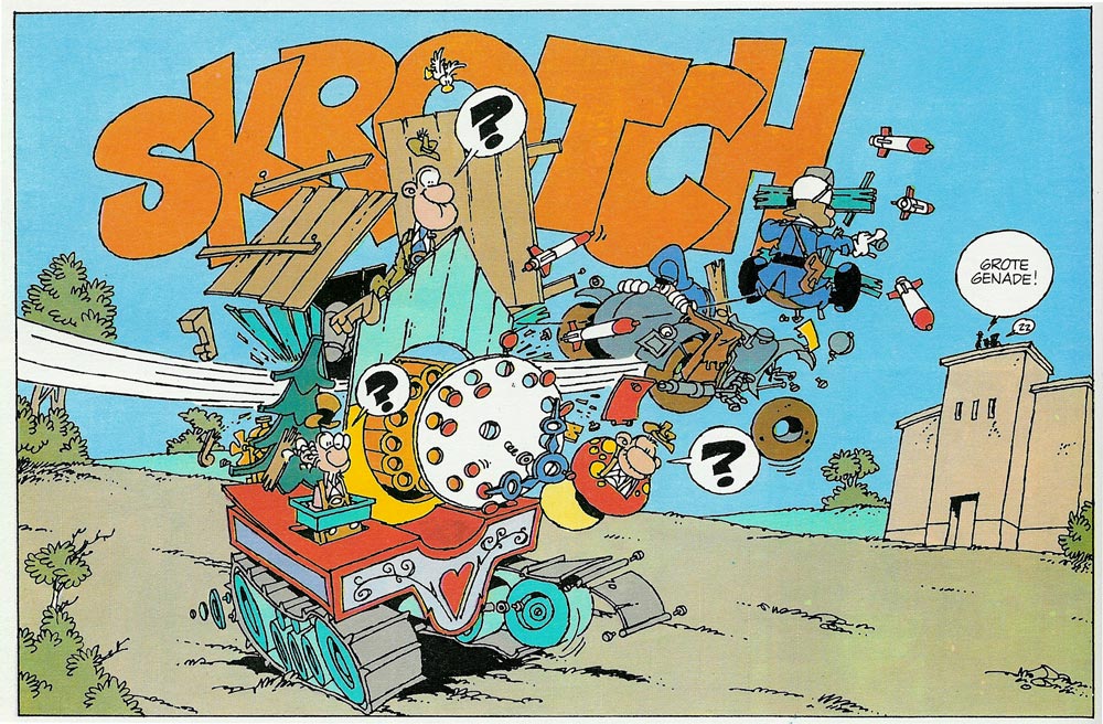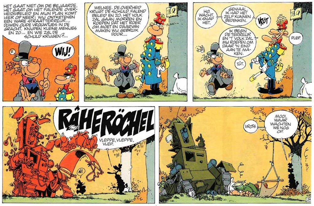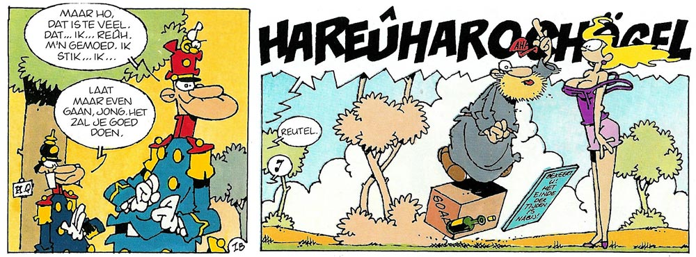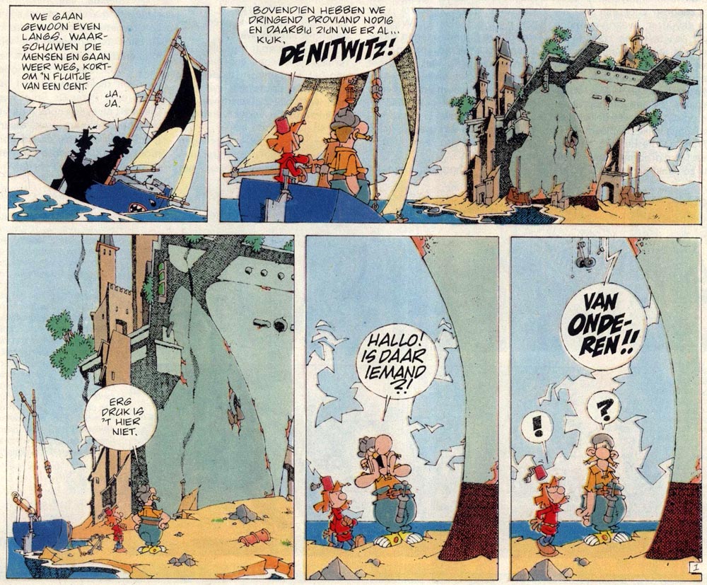 When the Belgian comic magazine Robbedoes got its own section with Flemish and Dutch comics, apart from French-language parent magazine Spirou, De Smet contributed 'Morgenster en Durandel' (1984-1985). The setting is a post-apocalyptic world, where mankind has returned to medieval living conditions, while some 20th century artifacts (most notably military weaponry) have remained. The adventures of De Smet's two heroes, strongly reminiscent of Albert Uderzo and René Goscinny's 'Astérix & Obélix', came to an end after only three short stories, as Robbedoes quickly returned to being simply a translation of Spirou. By the late 1980s, De Smet got the opportunity to publish in that other legendary comic magazine, Kuifje (Tintin). In 1988, former VNU marketing manager Rob Harren became head of the magazine's publishing house Lombard, and introduced the work of several Dutch artists in its pages. De Smet's first contribution was 'Rat en Wezel' (1988-1989), a funny animal gag strip about a hungry rat and weasel, which he had originally published in Dutch children's magazine Ezelsoor in 1985-1987.