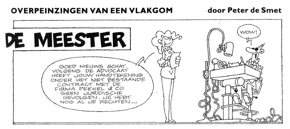 Peter de Smet's final 'De Generaal' story appeared in SjoSji #23 of 1997. Later in his career, De Smet also made 'De Meester - Overpeinzingen van een vlakgom', first for De Toestand (1990-1991), then for comics news magazine Stripschrift (1994-1998). With this comic strip/cartoon, the author gave cynical commentary on the Dutch comic industry and life as a comic artist. After this, no new comics material was made, although there are one or two advertising illustrations from a later date. Peter de Smet retired after turning ill, and passed away on 6 January 2003, at the age of 58.