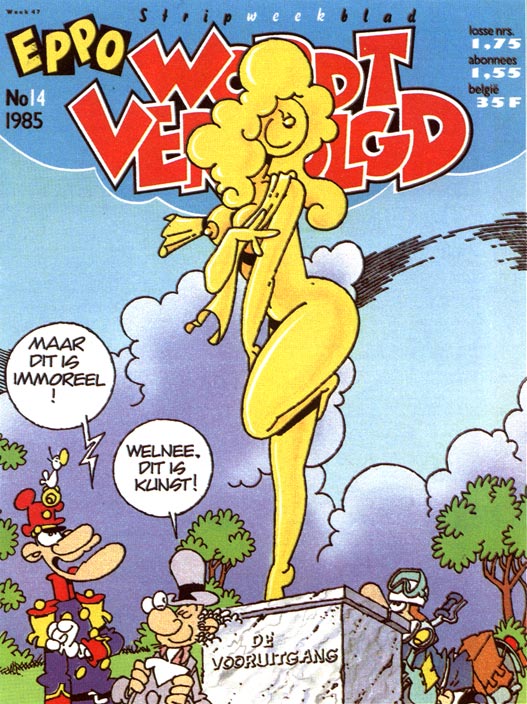 De Smet's final new creation for Pep was a short-lived gag strip about a completely unqualified guerilla soldier called 'Fiedel' (1974), clearly a pun on the name of Cuban revolutionary Fidel Castro. Even though only eleven strips were made, De Smet would reuse the comic's basic idea years later again. When Pep and Sjors merged into the comic magazine Eppo over the course of 1975, De Smet remained on board with his 'De Generaal'. More than that, the idea of combining Pep and Sjors into one big magazine originated during a pub chat between De Smet and Martin Lodewijk. The two presented their plan to the board of the VNU publishing group, who greenlighted it right away. De Smet had no ambition to become an editor, so Frits van der Heide took his place in the further developments. From then on, Peter de Smet would expand his activities by also associating himself with other magazines.