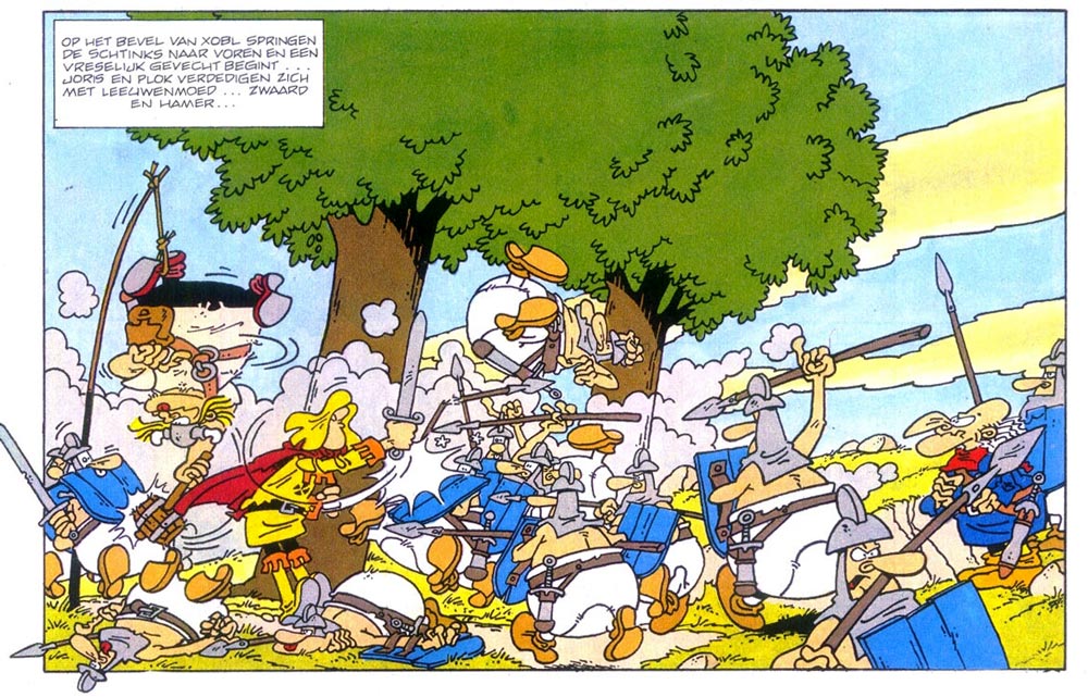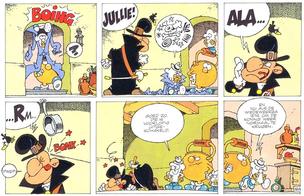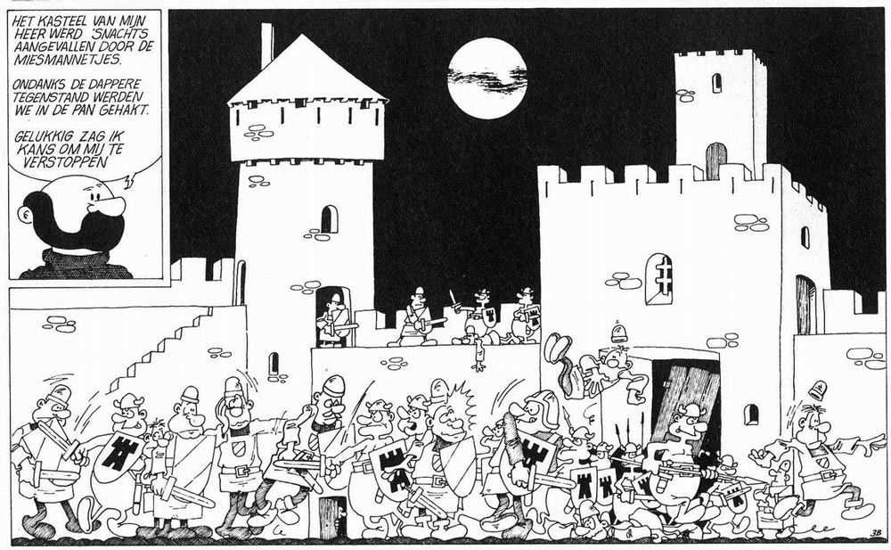 More successful was the serial 'Joris P.K.' (1972-1974), for which De Smet revived the concept of his earlier 'Fulco' strip. De Smet aimed at a medieval adventure comic in the style of Peyo's 'Johan et Pirlouit' ('Johan and Peewit'), but couldn't resist adding his own offbeat comedy. The main star is a knight in the court of King Stanislav of Transandijvië, sworn in to protect the kingdom from the invading armies of the brutal conqueror Xobl. Joris is aided by a former pirate called Plok, who is all brawn and no brain. The two protagonists are usually sent out on a senseless mission, which they fill with idle chatter. De Smet drew four stories of this series for Pep between 1972 to 1974, then two more for Nieuwe Revu in 1974-1975, and a final one for Eppo Wordt Vervolgd in 1986. Three of the Pep stories were collected in the Oberon series in 1976 and 1977, and reprinted by Maarten J. de Meulder in 1983-1984.