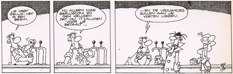 'Lodewijk'. Translation: "You're right. it's a start. Now only try to make Berlusconi so crazy that he'll pay 17 million for you... and the women will lie at your feet." (The gag references Italian businessman Silvio Berlusconi, who owned several football clubs and had bought Dutch dreadlocked football star Ruud Gullit to play for Italian football club AC Milan.)