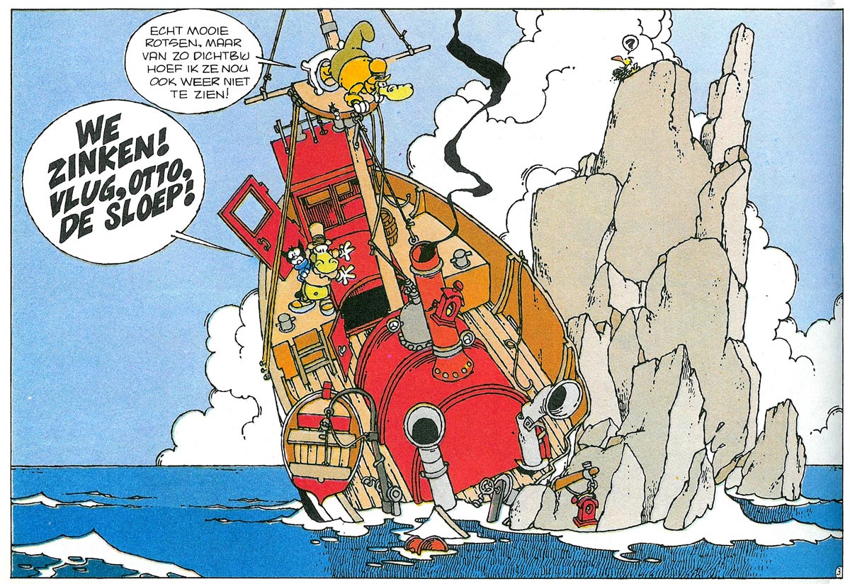 De Smet and Yvan Delporte worked together once more on two stories of 'Otto, Olivier en Oscar' (1981 and 1983), which appeared in Donald Duck weekly. The three anthropomorphic heroes sail the seas in search of a "land of plenty" called Quiqueboe, where "the people only eat cream and mocha cakes and where working is a dirty word". The two stories were collected in book format by Oberon in 1984, while 'Geen Garantie Voor Otto, Olivier en Oscar' was reprinted in SjoSji Extra in 1996.