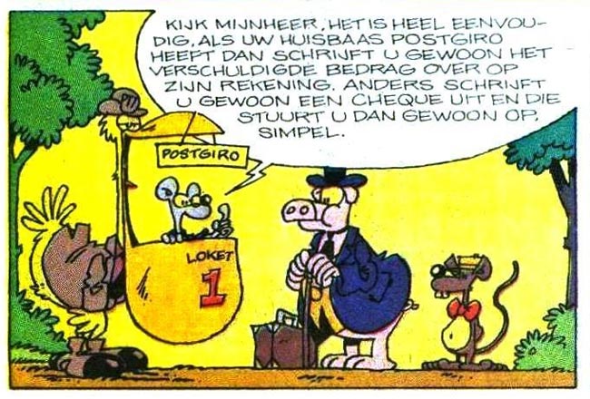 In addition to his more personal works, De Smet always continued to draw posters, illustrations and comic strips for advertising purposes through Elly op de Weegh's Art Connection agency. Throughout the years, he produced artwork for clients like Royal Dutch Shell, department store De Bijenkorf, supermarket chain Albert Heijn, Postgiro, Unilever, Nationale Nederlanden insurances, anti-smoking foundation STIVORO, the 1980 Olympic Games in Moscow and the Ministries of Education and Justice. Notable was the funny animal comic 'Pieter Pienter en de Postgiro' to promote the Dutch post office Giro service. These gag pages appeared in comic magazines like Donald Duck and Tina in the mid-1970s. Another assignment for the Postgiro was 'De Geschiedenis van het Geld' (1977), an informational booklet about the history of money, written by economist Arnold Heertje. It came with a teaching package containing 48 slides of all pictures in the booklet and a cassette tape with the spoken text. An updated version appeared in 1987. In 1980, he made a new comic strip for a brochure of the services, called 'Recruut Karel en de poen'. Between 1976 and 1985, Peter de Smet collaborated with Martin Lodewijk on the cartoons and comic strips for the annual Ryam school notebooks.