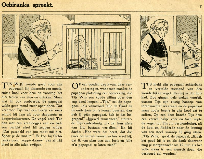 Between 1940 and 1942, 'Tijs Wijs' was published in De Telegraaf, as well as De Courant Het Nieuws van den Dag, with text by Herman Looman. Four books with the character were published: 'Het Avontuur met Oebiranka, de Wonderpapegaai', 'Bolletje Bink en de Wonderdokter', 'Avonturen met een Tooverring' and 'De Blauwe Diamanten van Bagdad'. Because of illness, one 'Tijs Wijs' story was drawn by Marten Toonder. By 1944, some 'Tijs Wijs' serials also ran in regional papers like Dagblad van Noord-Brabant and Limburger Koerier.