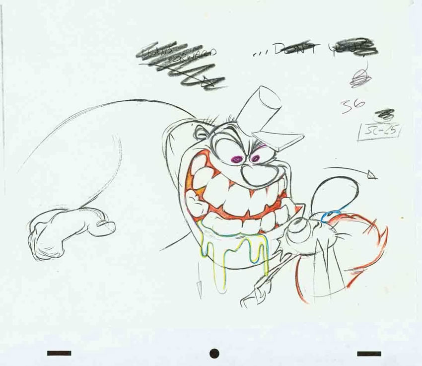 At Spümcø ,Jim Smith, John Kricfalusi, Bob Camp and Lynne Naylor became the main animation staff for the TV series 'The Ren & Stimpy Show' (1991-1995), broadcast on Nickelodeon. The show quickly gained a cult following thanks to its strange atmosphere, icky gross-out comedy, expressive animation and disturbing mental breakdowns of characters. Smith was an all-round artist on the show, coming up with story ideas, drawing storyboards, designing characters, backgrounds and lay-outs. In a blogpost, dated: 8 October 2013, John Kricfalusi said that he usually gave the moody scenes to Smith: (...) "Because being the heavy brooding type himself, he feels the depths of human torment more than anyone and is only too happy to have his audience plumb the depths with him." Smith also specialized in designing rugged, very muscular characters like Powdered Toast Man and the Fire Chief. Kricfalusi: "Jim has many talents but the one that I find the most original and unique is his ability to make really serious drawings and moods look funny." He additionally praised him for having a "totally own unique style that isn't part of a school. There aren't many artists like that, and that's what makes him so valuable to the cartoons I like to make. He has many talents no one else (including me) has and I rely on him to do all the hard stuff. He's a master of composition and solidity." Interviewed for Pop Culture Magazine (October 1996), Kricfalusi credited Smith for coming up with the plot of the episode 'Space Madness' and almost single-handedly doing another episode, 'Untamed World'.