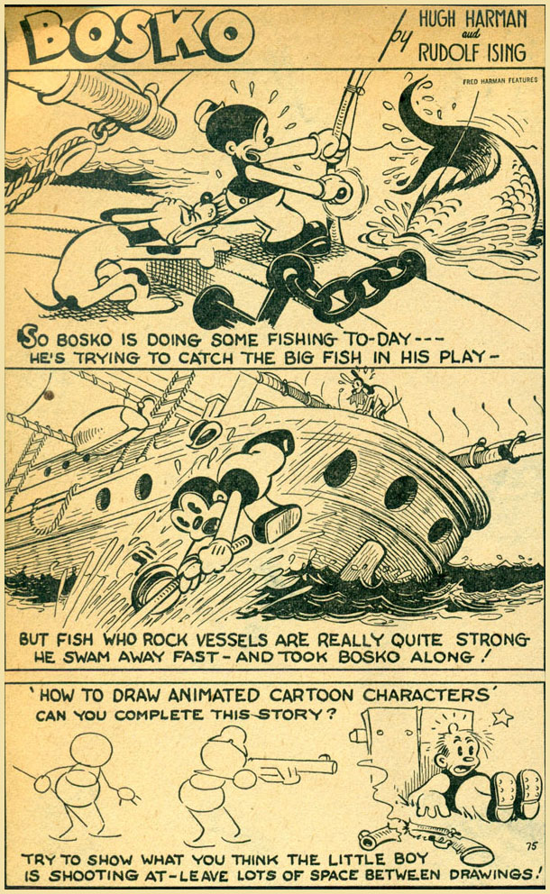 In the first half of the 1930s, Win Smith joined the brand new animation studio at Warner Brothers, founded by Hugh Harman and Rudolph Ising. In the previous years, Warners launched several animated series, such as 'Bosko' (1929-1933), which was adapted into a newspaper comic version in 1934. The comic strip was credited to Hugh Harman and Rudolf Ising, but actually drawn by Robert Allen and later Win Smith. The feature was typically a story starring Bosko, with at the bottom a companion strip, usually a drawing lesson under the title 'How to Draw Animated Cartoon Characters'. Interestingly enough, the comic followed the text comics format, with narration in captions underneath the images. The first 66 episodes were stand alone gags, after which the feature evolved into a serialized story under the title 'Bosko on Cannibal Isle'.