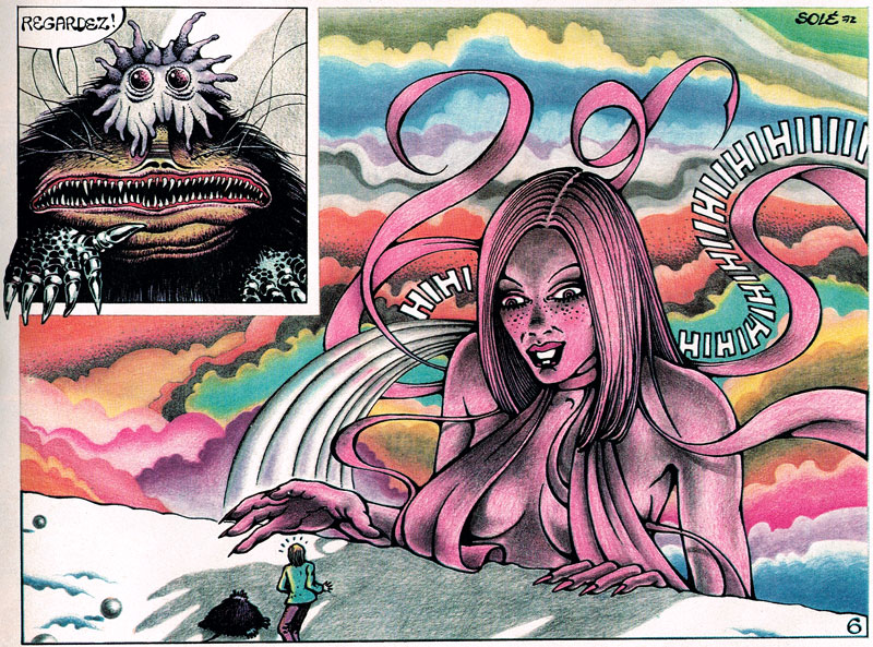 Jean Solé is a French comic artist and illustrator, who stood out for the absurd and sometimes psychedelic drawings he made for magazines like Pilote, Fluide Glacial and L'Écho des Savanes. Born in Vic Fezensac, Gers, he made his first appearance in Pilote magazine in 1971. He participated on several news pages in cooperation with Guy Vidal, Jacques Lob, and Jean-Marie Pélaprat, and also made a great many caricatures. He made the psychedelic comics serial 'Jean Cyriaque' with scenario-writer Jean-Pierre Dionnet in 1972-1973, but became best known for his full-page illustrations of grotesque fantasy animals.