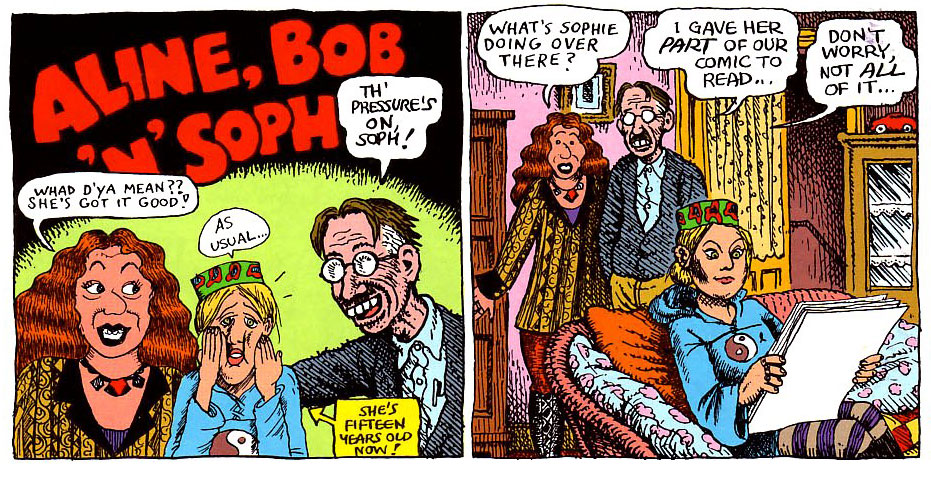 In the late 1980s, Sophie was occasionally portrayed in her parents' crossover comic series 'Dirty Laundry Comix', starting off in Weirdo issue #9 (Winter 1983-1984). Robert Crumb and Aline Kominsky had often depicted their personal lives in comics in which they each drew themselves. Since Sophie was now part of their household, it was only natural that she too made appearances. One particular scene with Sophie from 'Dirty Laundry Comics: More Clean Fun With The Crumb Family', published in Weirdo issue #16 (Spring 1986), caused controversy among some of their readers. It portrays Sophie lying on the ground, rubbing her crotch because "my twat is broken and I'm trying to fix it", while Robert and Aline aren't particularly bothered by her behavior. Though, it should be pointed out that many scenes in Dirty Laundry Comics aren't necessarily autobiographical, just Crumb and Aline poking fun at themselves. In later 'Dirty Laundry Comics' episodes, Sophie would sometimes draw herself, but usually not more than one or two panels. When Last Gasp issued a compilation book, 'The Complete Dirty Laundry Comics' (June 1993), it included both reprints and brand new material, in which Sophie was also represented. She appears on the cover and in the opening panel of the penultimate story, 'Euro Dirty Laundry "Merci Au Revoir!"'. On the back cover of 'Self-Loathing Comics' (issue #2, 1995), she has a larger role, depicting herself in all panels of this one-page gag comic.