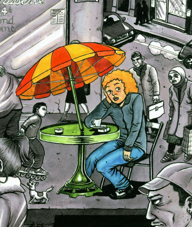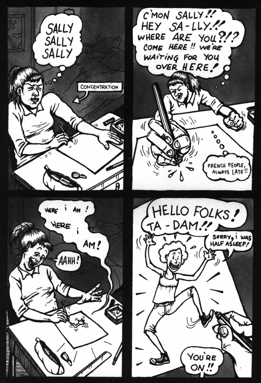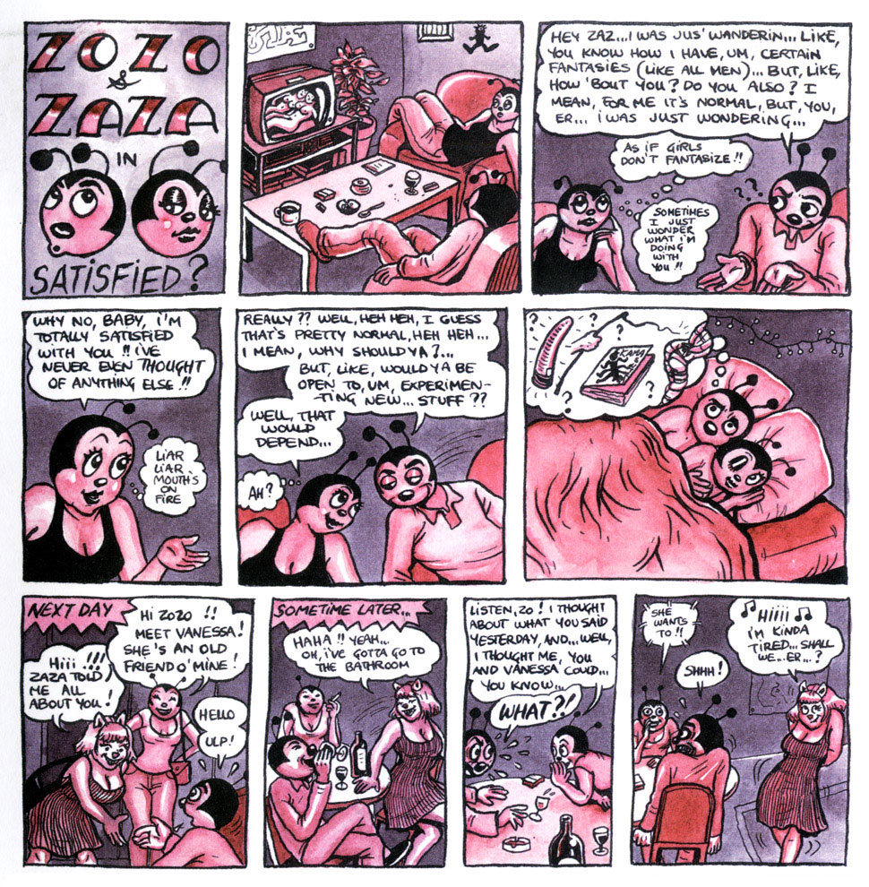 The 'Belly Button Comix' volumes are collections of short stories. Some are twisted funny animal comics. 'Zozo and Zaza' feature an insect couple, drawn in a Fleischer-esque style. Most of their gags revolve around their problematic sex life. 'Eddy Bear' is a pantomime comic about a teenage bear who runs away from home. As his story continues, he suffers increasingly sleazier and disturbing mishaps. Sophie sometimes uses the fictional character Sally La Frite as an alter ego. In other tales, she directly portrays herself. Her autobiographical stories visualize some of her personal experiences with relationships and drugs. A large amount of the second volume is devoted to her wandering Berkeley years. Other comics investigate her artistic ambitions, weird dreams and additional anxieties.