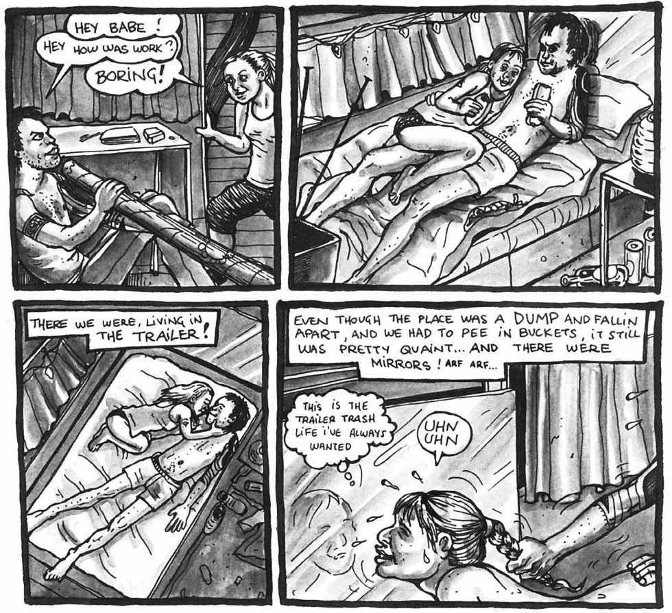 Sophie hoped her boyfriend would kick his unhealthy habits. But since she too got high on a regular basis, nothing changed. All their spare time and money went into finding, buying and taking drugs. After many arguments, the couple broke up. Sophie moved to Brooklyn, where she worked as a tattoo artist for a while. Sophie credits tattooing for helping her evolve her drawing technique. Reflecting on her wandering life in the fringes of society, she recalled it was basically "a hell". Sometimes her poverty was so extreme that she and her housemates had to raid dumpsters for food. Some of her experiences have been adapted into comics published in 'Belly Button Comix, Volume 2' (2004).
