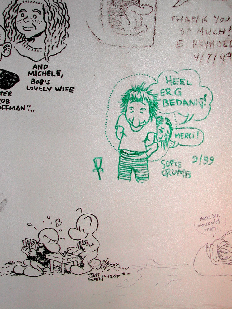 Drawing made by Sophie Crumb on the wall of the "cartoonist loft" above the Amsterdam comic store Lambiek (1999). Above we also see a tribute by Eric Reynolds and underneath by Jeff Smith.