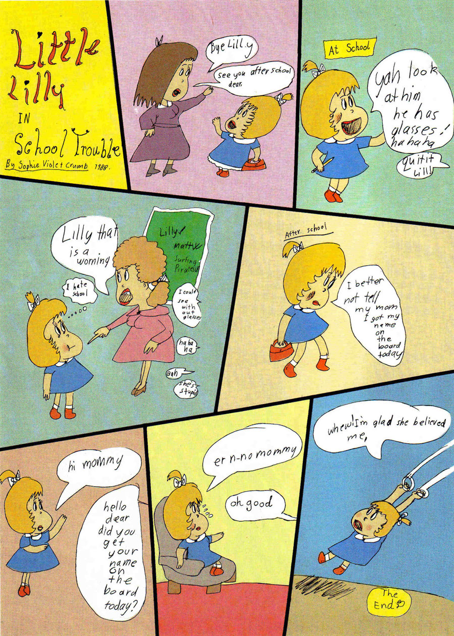 Sophie's actual full-page comic debut was in Weirdo issue #23 (Summer 1988). On the back page, her gag comic 'Little Lily in: School Trouble' was printed in full color. The story shows influence from John Stanley's 'Little Lulu' and features a girl lying to her parents, but still being believed. At the time, Sophie was seven years old, making her one of the youngest people ever to publish a comic in a professional magazine. The next year, she contributed a comic to Wimmen's Comix issue #15 (1989), titled 'When I Have A Little Girl' and signed with "Sophia Crumb".