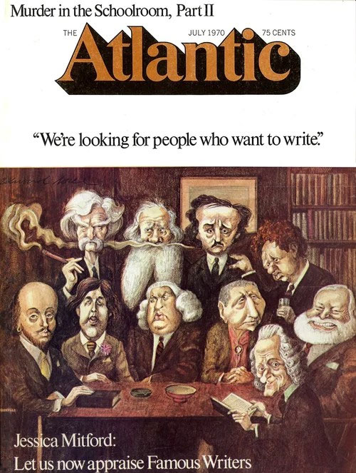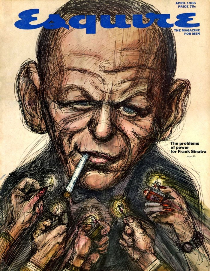 Cover drawings with caricature of Frank Sinatra for Esquire (April 1966) and of writers Mark Twain, Leo Tolstoy, Edgar Allan Poe, an unidentified writer, William Shakespeare, Oscar Wilde, Samuel Boswell, another unidentified writer, Voltaire and Ernest Hemingway, for The Atlantic (July 1970).