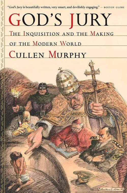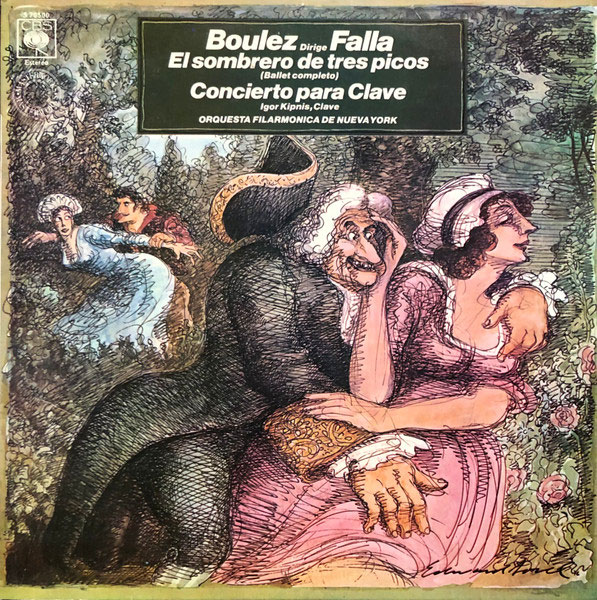 Cover art by Edward Sorel for a classical music album devoted to the music of Manuel de Falla and Cullen Murphy's non-fiction book 'God's Jury'.