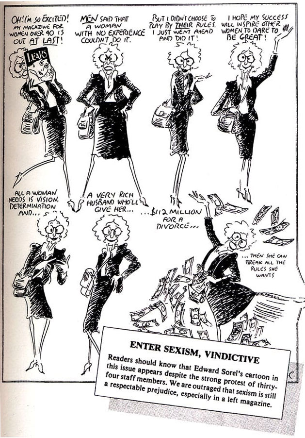 In 1985, the feminist activist Frances Loeb, better known as Frances Lear, divorced her husband, Norman Lear, most famous as the scriptwriter of the taboo-breaking satirical sitcom 'All In The Family'. She used money from her million-dollar divorce settlement to establish a women's magazine, Lear's (1988), aimed at women over 40, telling them it is never too late to start a new life to fulfill themselves. In the next issue of The Nation, Sorel satirized her, expressing the same message, but with the stinger punchline: "All a woman needs is vision, determination and a very rich husband who'll give her... 112 million dollars for a divorce... then she can break all the rules she wants." The Nation's staff, however, felt the need to add an editor's note, distancing themselves from the cartoon, which they perceived as "sexist". The controversy quickly snowballed into a national press story, but Sorel had no regrets.