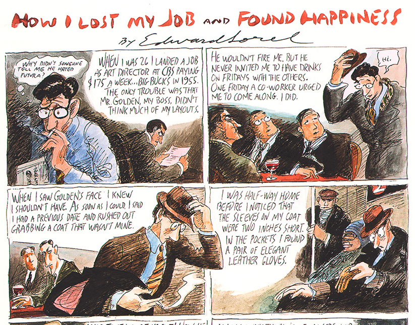 Edward Sorel went to the High School of Music & Art, but regarded it as a waste of time, since the teachers focused more on theory than on actual drawing. He followed it up with studies at The Cooper Union for Advancement of Science and Art in Manhattan, where he befriended future talents Seymour Chwast and Milton Glaser. Interviewed by R.O. Blechman for The Comics Journal (25 October 2012), Sorel remembered that he was "in the clique with the losers", while Glaser and Chwast were among the talented artists. After graduating in 1951, Sorel managed to get hired and fired by no less than eleven companies, which he claimed must have been "a record". Every time he applied for a different company, he snuck some graphic designs by more skilled colleagues in his portfolio, which helped him get hired with a much higher salary than before, but once his editors noticed he wasn't the virtuoso he claimed, he was just as quickly shown the door again. Interviewed by Gary Groth for The Comics Journal issue #158 (April 1993), Sorel recalled that "by the middle of 1951, I was lasting on jobs only about three days before they realized I was unsuited for it." Eventually, in 1953 he managed to get a longer-lasting job at Esquire magazine, where he was later joined by Chwast. Being able to rely on his friend's advice and help, caused Sorel's artwork to improve. But after working for 11 months for this publication, the editors decided to fire half of the art staff.