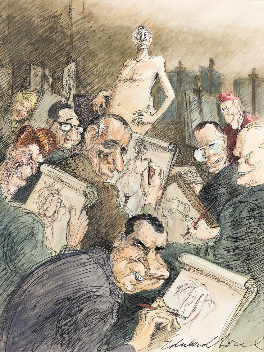 Edward Sorel is an American magazine illustrator, caricaturist and comic artist. Working in a scribbly, spontaneous style, his favorite recurring topics were Hollywood stars, politics and organized religion. Apart from drawing satire, Sorel also drew biographical comics about literary giants under the banner 'Literary Lives', serialized in The Atlantic in the early 2000s. Late in his career, Sorel released the acclaimed graphic novel 'Mary Astor's Purple Diary: The Great American Sex Scandal of 1936' (Liveright Publishing, 2016), about the turbulent life and career of Hollywood actress Mary Astor. Sorel's caricatures have often received awards and have been the subjects of thematic expos.