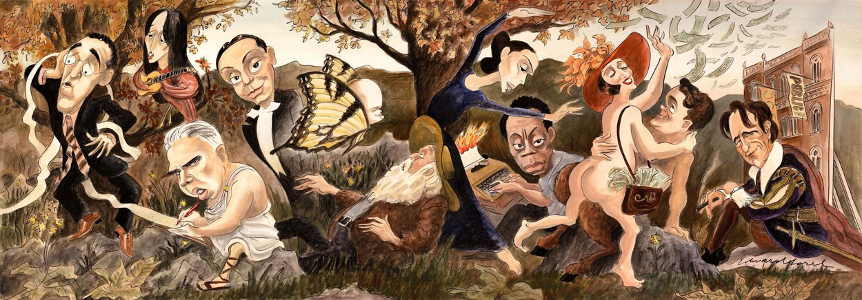A section of Edward Sorel's Waverly Inn mural (2007). From left to right: columnist S.J. Perelman, folk singer Joan Baez, novelist Theodore Dreiser, composer Cole Porter, novelist Truman Capote, poet Walt Whitman, dancer Martha Graham, writer and activist James Baldwin, socialite Mabel Dodge, journalist John Reed and theatre producer Joe Papp.