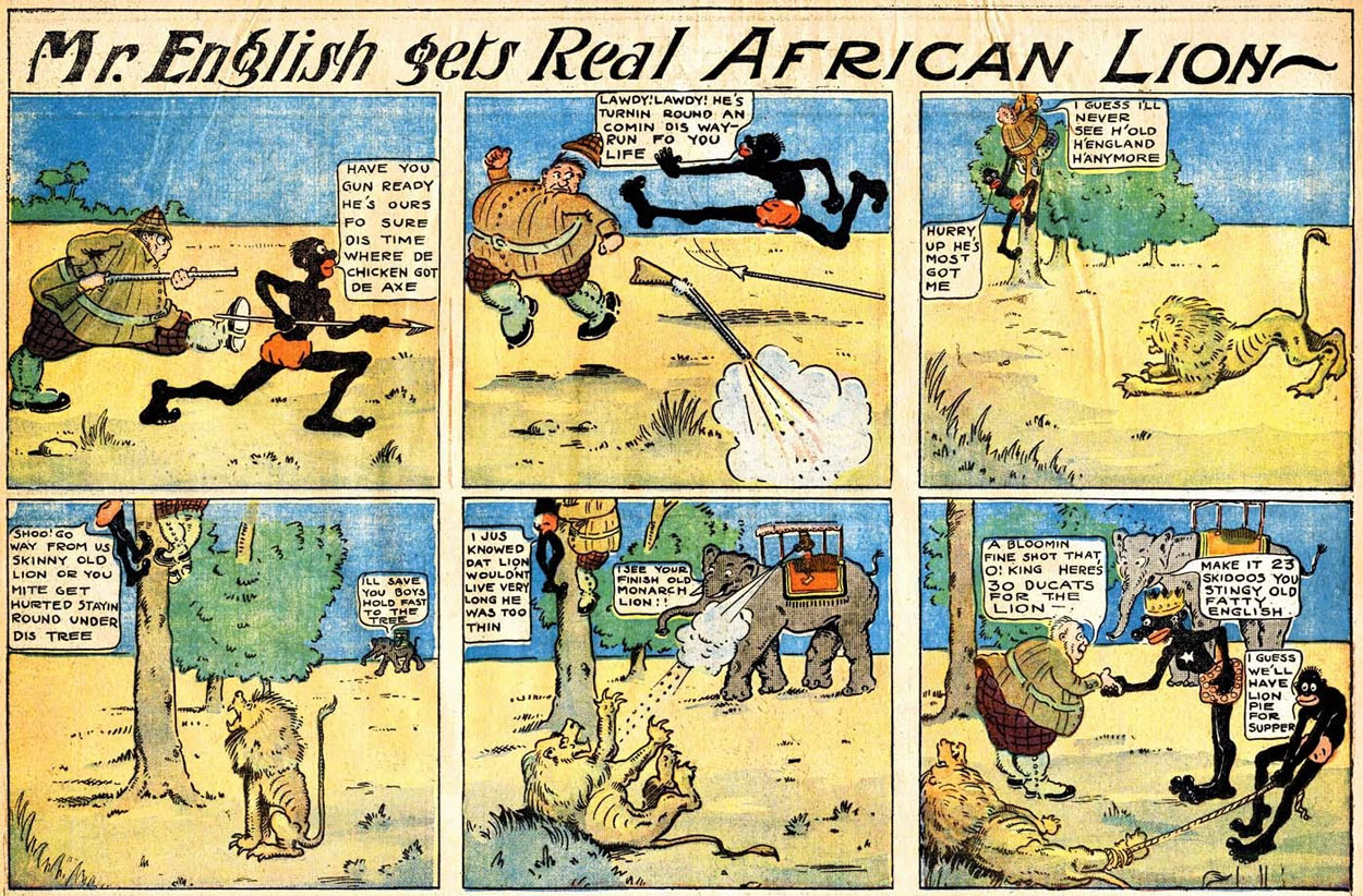 In 1906, Spencer drew two Sunday comic features for The Philadelphia Inquirer. Between 30 September and 2 December 1906, the paper ran Spencer's 'Fatty English', sometimes known as 'Mr. English'. Fatty English is a corpulent British game hunter who, together with his stereotypically presented black guide, prowl for African wildlife to kill. The local African king Vilkiloo III usually has to save the two out of sticky situations, and ask a hefty fee afterwards. Spencer subsequently created another animal-themed feature called 'Oscar's Menagerie', about a man and his large collection of talking animal friends. This Sunday feature ran only twice, on 9 and 16 December 1906.