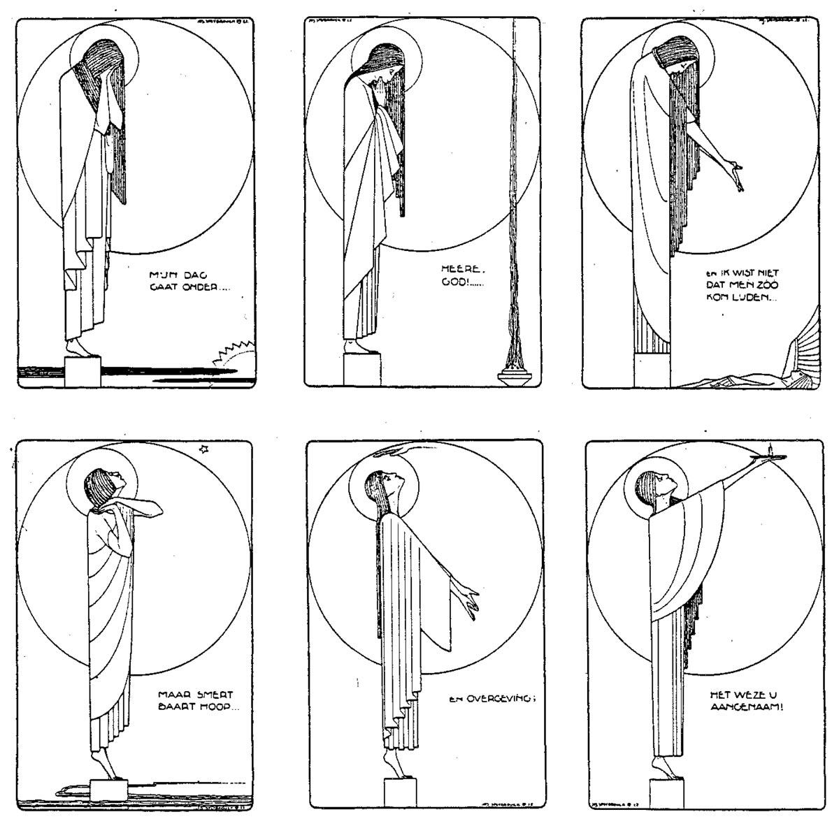 One of Speybrouck's most beautiful projects was 'Levenslijnen' ('Lifelines', 1928), in which he brought his graphic style to its most minimal essence. The illustrations depict an angelic woman praying to God. She is stylized into a horizontal, almost rectangular character. The background consists of only a huge circle, while the drawings themselves are an interesting display of circles, rectangles and triangles put in a geometrical balance. 'Levenslijnen' is the closest Speybrouck ever came to making a comic strip with speech balloons, seeing that the monologues are written within the images rather than underneath them.