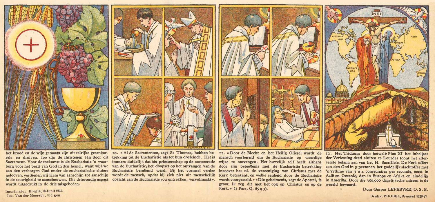 Between 1923 and 1938, Speybrouck worked on the longest and most productive assignment of his career. The abbey of Loppem asked him to make illustrations intended for Sunday and Christian holiday masses. These drawings were used during religious ceremonies, at schools and in magazines like Bulletin and La Croisade Liturgique à l'École. He also made maps and didactic illustrations for pupils to cut out. The manual 'Pour Comprendre La Messe' ("To Understand Mass") was a supplementary publication which explained each ritual through the use of text and drawings, once again provided by Speybrouck. This monumental project is easily the artist's magnum opus. Over a period of fifteen years, he made nearly 800 color illustrations that visualized several key moments from the Old and New Testament in text comic format, with the narrative in captions beneath each image. These comics were later published in book form by Gaspard Lefebvre, abbot of Loppegem, in French as 'Le Cycle Liturgie en Images' and in Dutch as 'Het Kerkelijk Jaar in Beeld' (1931-1932). Catholic educators considered them so useful that they distributed them all over Flanders, also translating them over the Belgian borders. Despite the success, Speybrouck felt working on the same topic for more than a decade was tiring, while Catholic censors left him with little creative freedom.