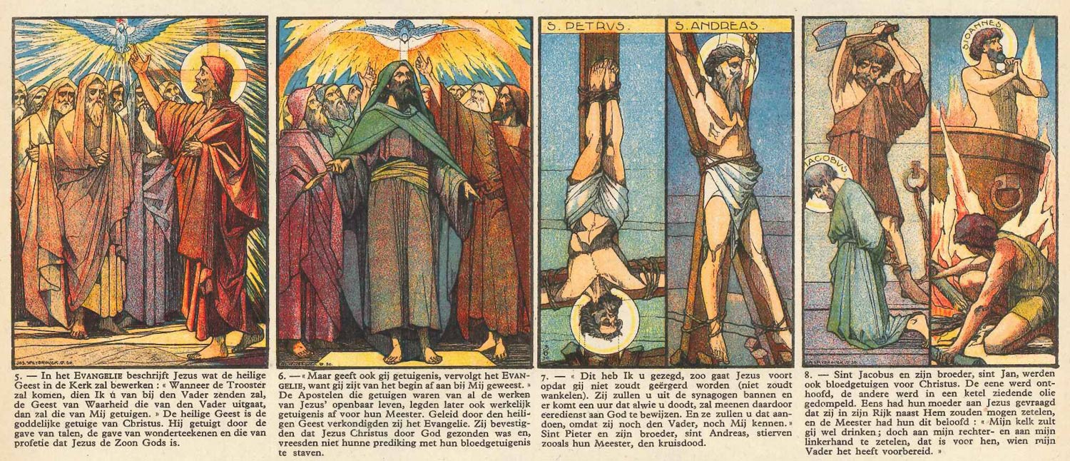 Speybrouck made several other religious picture stories, such as the 'Missiereeks' ("Mission series", 1925) for the Redemptorist movement. These six illustrations symbolized and glorified the actions of Catholic missionaries abroad. 'Via Crucis' (1928) was a text comic adaptation of Jesus' Calvary, while 'De Zeven Weeën van Maria' (1928), depicted the Virgin Mary's labor pains. '15 Heilige Geheimenissen' (1929) visualized glorious Christian mysteries and their emotional impact through one and the same character. 'Sterrenbeelden' (1929) was a graphic interpretation of all animals and symbols of the Zodiac. 'Levensgang' (1929) had a more philosophical tone, illustrating the heights and lows of one person's life until the inevitability of death, while 'De Zeven Werken van Barmhartigheid' (1929) depicted the Seven Virtues. In 1932, the artist also illustrated biblical history in the book 'Bijbelse Geschiedenis' by Dr. J. Keulers.