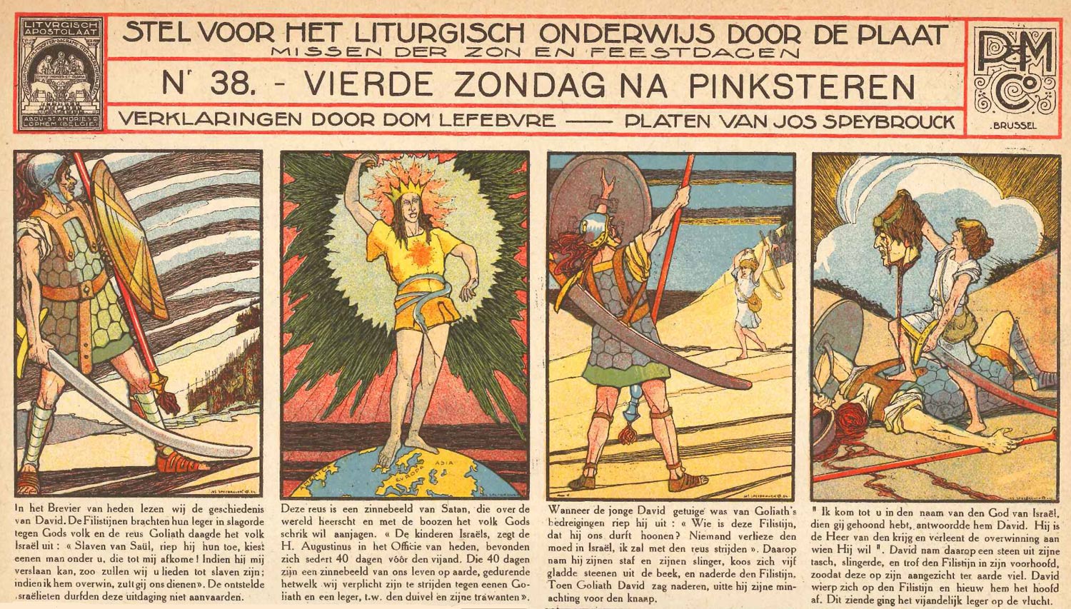 Educational text comic by Jos Speybrouck, depicting David slaying Goliath, 1931-1932.