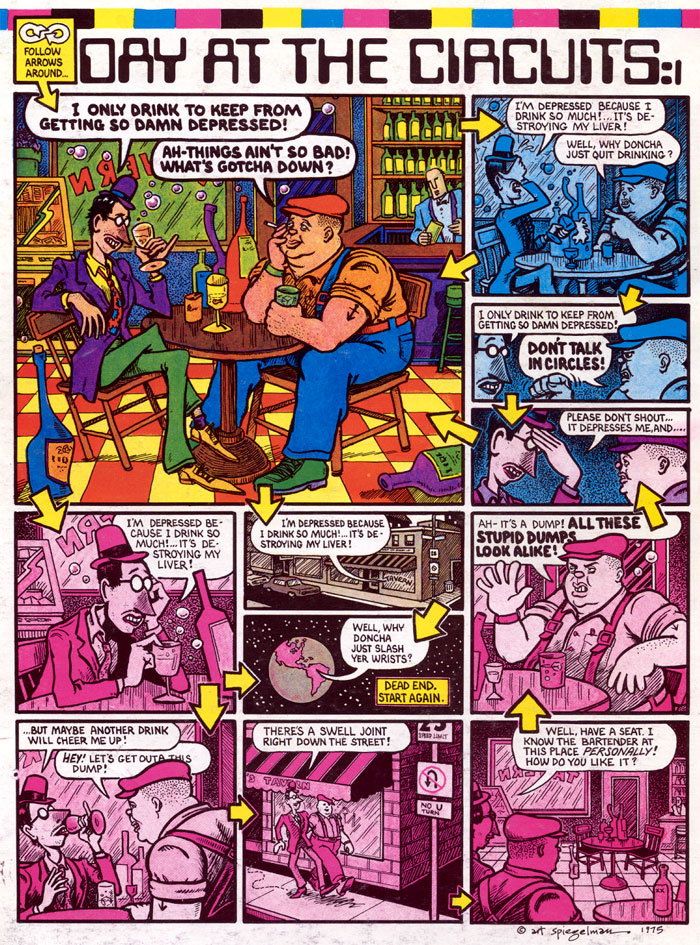 Spiegelman's Arcade cartoons featured bold graphic experiments, displaying his increasing complexity as an artist. His subconscious inspired some strips, such as 'A Hand Job' (Arcade #1) and 'Real Dream' (Arcade #2). In 'Day at the Circuits', two drunks in a bar engage in a circular conversation as the reader follows various arrows from panel to panel. In the sixth issue, Spiegelman manipulated small panels from the newspaper comic 'Rex Morgan: M.D.', drawn by Marvin Bradley, incorporating them within his own drawings, creating a collage comic with optical illusions: 'Nervous Rex the Malpractice Suite' (1976).