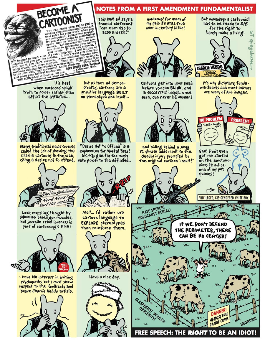 Since his graphic novel 'In the Shadow of No Towers' (2004), about the 9/11 terrorist attacks on the World Trade Center and war on terror, Spiegelman became more outspoken in his views regarding racism, religion, censorship, U.S. politics and freedom of speech. In June 2006, he wrote an article for Harper's Magazine, regarding the public outrage over a series of cartoons published in the Danish newspaper Jyllands-Posten, which depicted the Prophet Muhammad. The essay, 'Drawing Blood: Outrageous Cartoons and the Art of Outrage', looked back at the history of cartoon censorship and took a stand against it. In January 2015, editors of the French satirical magazine Charlie Hebdo were murdered by terrorists for ridiculing Muhammad, once again sparking debates about the freedom of speech in comics. Spiegelman made a one-shot comic, 'Notes From a First Amendment Fundamentalist', in which he defended "the right to be offended in cartoons".