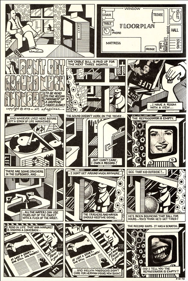 'Don't Get Around Much Anymore' (Short Order Comix #2, 1974). A stream-of-consciousness depiction of loneliness and isolation, with a man sitting in his living room while random thoughts about his surroundings come to his mind.