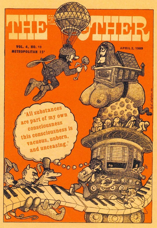 In 1963, Spiegelman founded his own fanzines, Blasé and Smudge, self-publishing his first cartoons and comics. A year later, he sold his first professional cartoons to The Long Island Post and the United Features Syndicate. Spiegelman made short comics and flyers, such as 'A Flash of Insight' (1965-1966), 'This Is A Sheet Of Paper! Look At It And Touch It' (1967) and 'Yes, Play With Your Cells, and Become Your Own Food' (1967). As a student at Harpur College between 1965 and 1968, he was staff cartoonist and editor for the college newspaper. Later in the 1960s, Spiegelman became involved in the "underground comix" scene, meeting many of the artists who inspired him, including Robert Crumb. Like Crumb, Spiegelman illustrated a few covers of 'The East Village Other' in 1969. In the late 1960s and early 1970s, Spiegelman's comics appeared in Wallace Wood's witzend magazine, the all-comics tabloid Gothic Blimp Works and the underground comics Bijou Funnies, Young Lust, Real Pulp and Bizarre Sex.