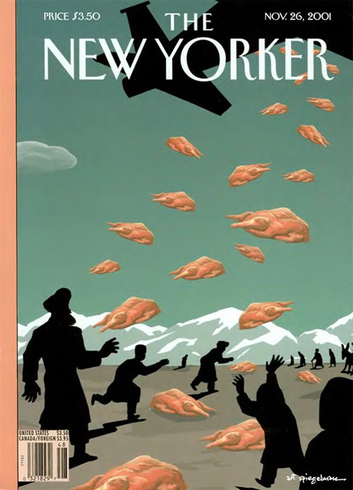 Other Spiegelman New Yorker covers received positive feedback. Saul Steinberg praised his 1996 cover 'Family Values', depicting a happy family of beatnik grandparents, hippie parents and a punk rock daughter and her newborn baby. Spiegelman was also praised for his iconic cover in remembrance of the victims of the 11 September 2001 attacks, done in collaboration with his wife Françoise Mouly, the art editor of the magazine since 1993. On first glance, the cover appears to be completely black. But on closer inspection, one can see the contours of the World Trade Center towers in a slightly lighter shade of black. 'Kisses From New York', a compilation of Spiegelman's work for The New Yorker, featuring a foreword by novelist Paul Auster, was published by Penguin Books in 2006.