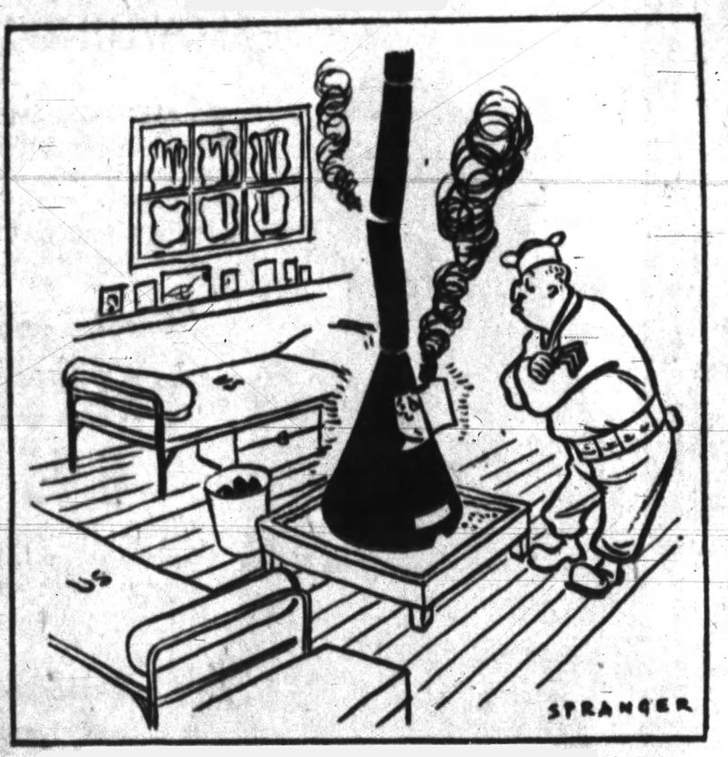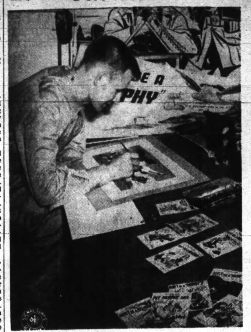 Sergeant Spranger at work, and one of his military cartoons (from: The Anniston Star, 2 April 1944).