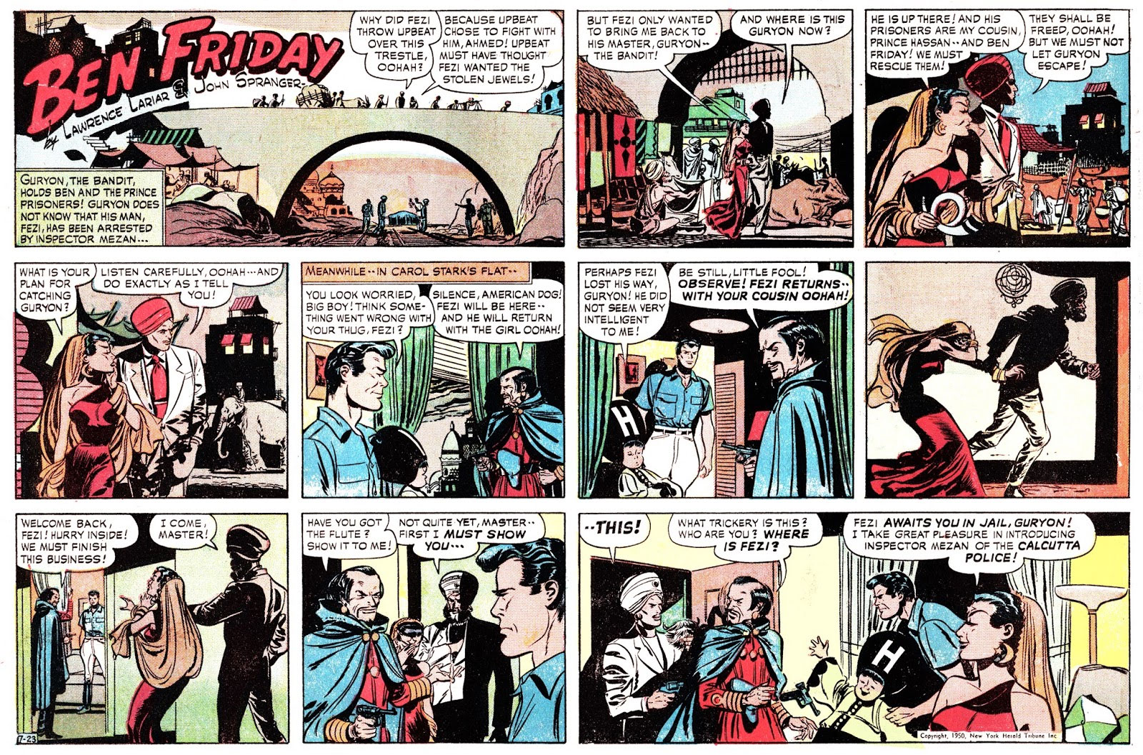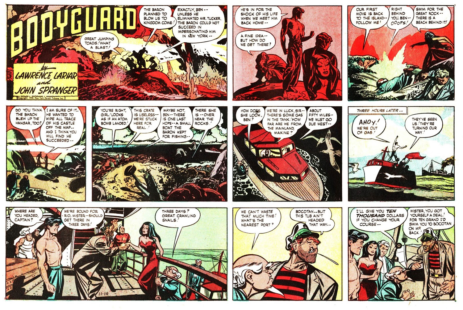 After a couple of years, Spranger turned to newspaper comics. In 1948 he created the adventure strip 'Bodyguard' with cartoonist/writer Lawrence Lariar. It was a daily and weekly strip for the Herald Tribune Syndicate, which debuted on 5 May 1948. The hero, Ben Friday, was an adventurer in the style of Roy Crane's 'Captain Easy', although the drawing style was closer to what Spranger had been doing on 'The Spirit'. In fact, many of the secondary characters looked as if they had walked out of one of Will Eisner's stories. Despite the terrific artwork and engaging stories, the syndicate had trouble selling the strip (as they had with most of their product in the late 1940s) and on 11 July 1949 it was decided to drop the bodyguard gimmick and continue the strip under its hero's name, 'Ben Friday'. In October 1950, Ben Friday himself was dumped in favor of his comic relief sidekick, The Bantam Prince. The strip was renamed after him (with Ben leaving after two weeks to get married). In June 1951 John Spranger himself gave up and left. 'The Bantam Prince' was inherited by another comic book refugee, Carl Pfeufer, who continued the feature until its demise on 28 February 1954.