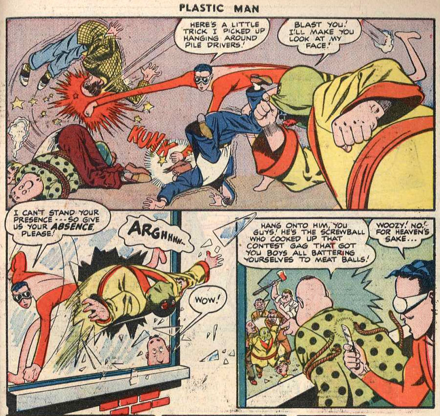 Story with art attributed to John Spranger from 'Plastic Man' #8 (1947).