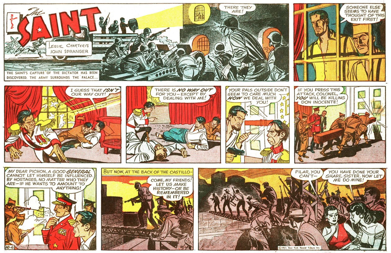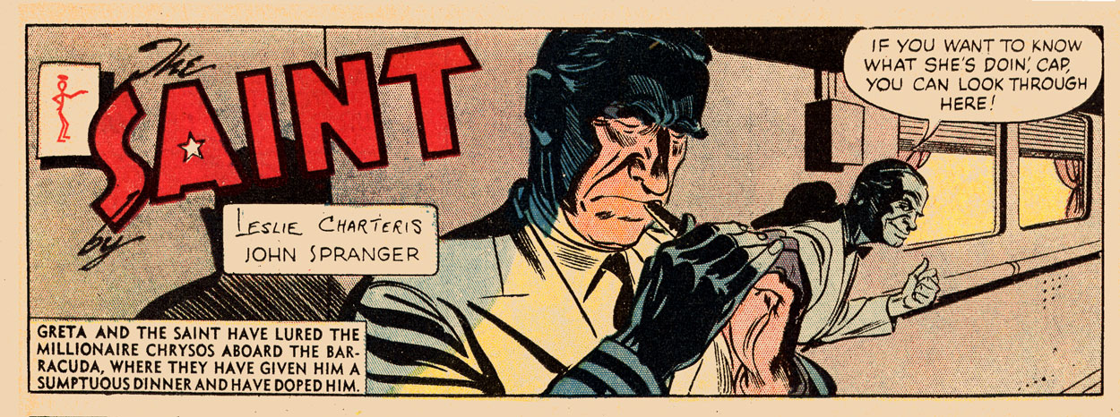 Soon after leaving 'The Bantam Prince', John Spranger took over as the artist on Leslie Charteris' 'The Saint', replacing Mike Roy, who had started the strip only four months after the launch of 'Bodyguard' by the same syndicate. Although 'The Saint' never looked as lush as his previous strip, Spranger had a successful run with Charteris' Robin Hood-like criminal until dropping out in mid 1959. After that, Bob Lubbers took over anonymously, while also drawing the daily and Sunday comic 'Long Sam'. Doug Wildey was the official artist of 'The Saint' during its final year, from 10 January 1960 until 16 September 1961.