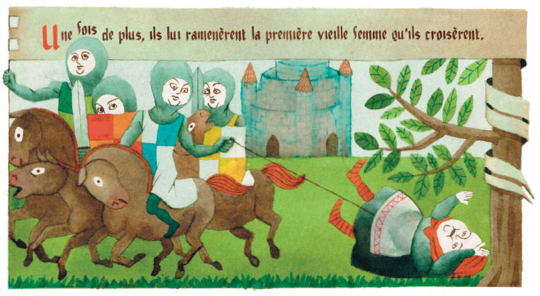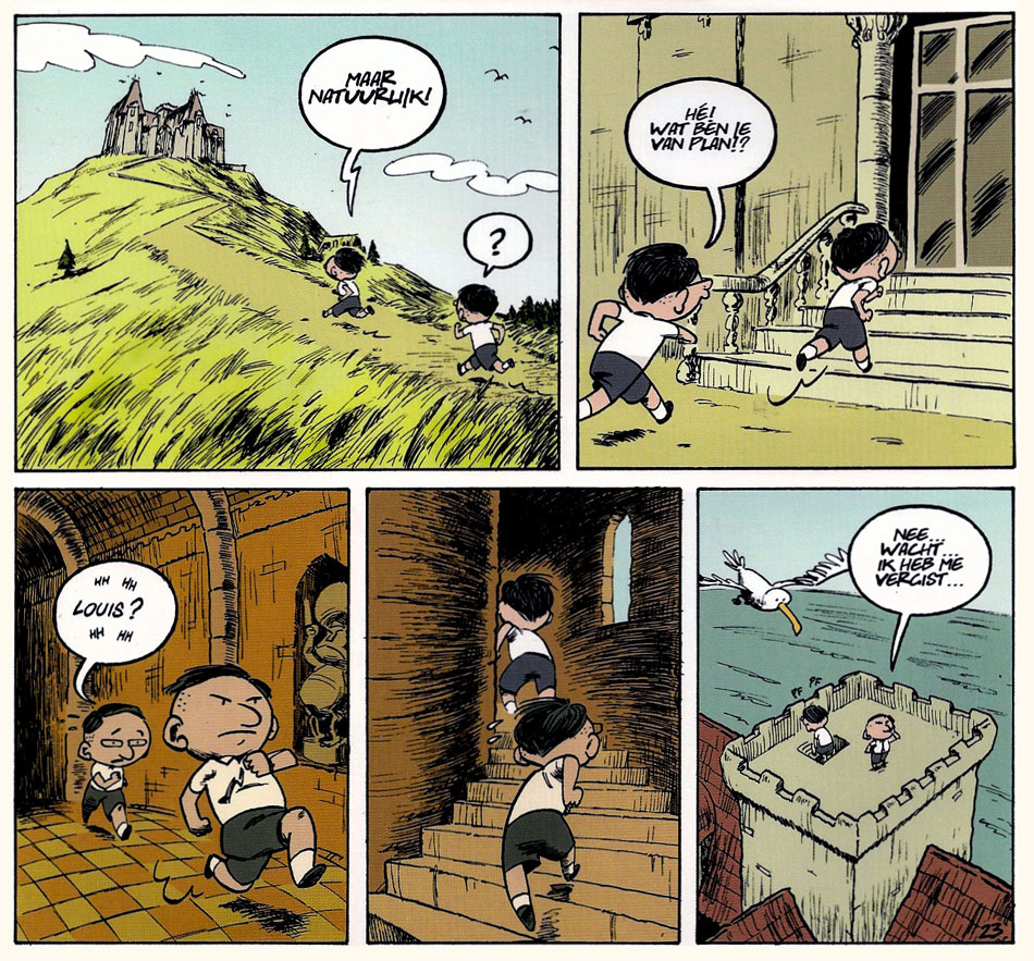 With 'Papa Zoglu - De Wonderbaarlijke Reizen van de Koeienprins' (Bries, 2017), Spruyt went for a less historically accurate route. Set in a surreal version of the Middle Ages, all artwork is presented in a pseudo-medieval miniature style. A little boy, Zoglu, is raised by a witch. When he learns that his biological mother is a cow, he decides to go look for her. During his quest, Zoglu meets two gay Teutonic knights, a woman who wants to get rid of her chastity belt and an albino chimney sweeper.