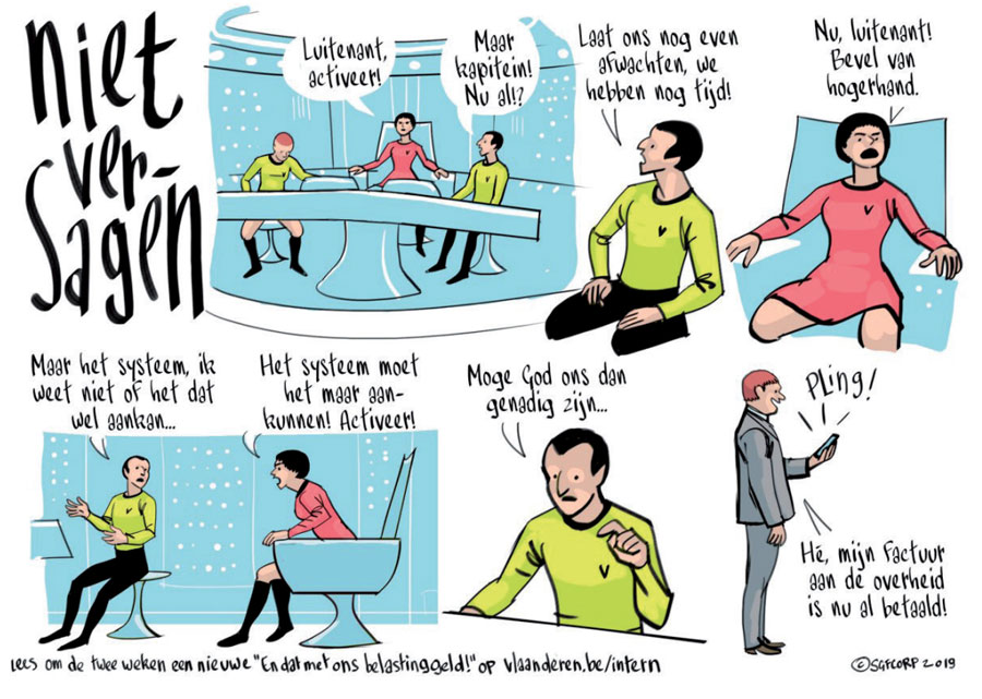 'En Dat Met Ons Belastinggeld' (2019). The government is depicted as the crew of 'Star Trek' who activate a system, despite some crew members advising to wait, "because we're not sure whether the system can cope with it." The man in the final panel concludes: "Hey, my bill to the government has already been paid."