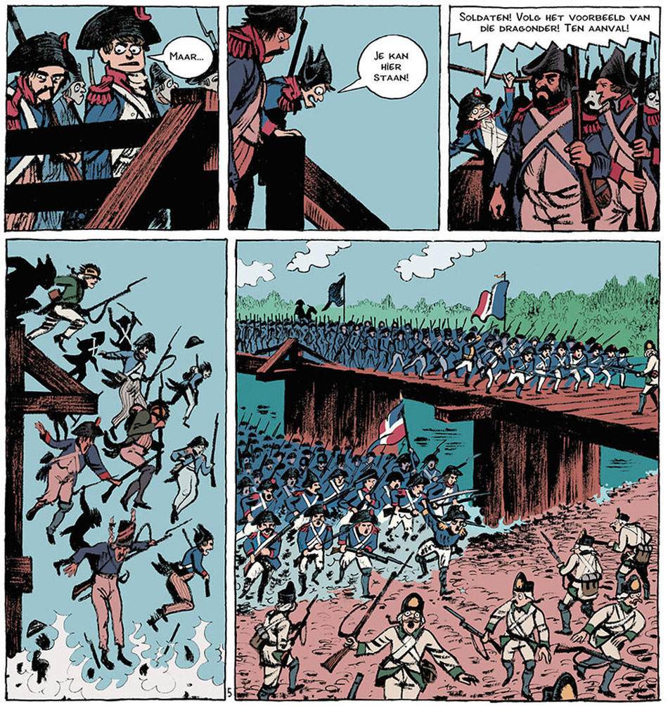 When Simon Spruyt's next concept was rejected by Le Lombard, the publisher connected him to the French comic writer Nicolas Juncker. Commissioned to write a new comic series, Juncker was familiar with Spruyt's 'S.G.F.' and so set out for something more edgy than Le Lombard's otherwise family-friendly comics. For Spruyt, the historical parody trilogy 'De Ruiterlijke Confessies van Dragon Dragon' (Les Mémoires du Dragon Dragon, 2022-2025) was the first time since 'De Bamburgers' that he worked with a comic writer. Luckily, he and Juncker became good friends, and collaborated on both the script and the lay-out. The main narrative, divided over three volumes, is set in France, at the turn of the 18th into the 19th century. Pierre-Marie Dragon is a soldier who gets caught up in the Napoleonic Wars and manages to survive the most dangerous (and wittiest) situations by dumb luck. Spruyt was responsible for adding the character of Anselme.
