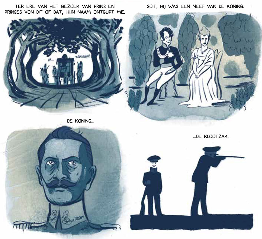 Spruyt's next graphic novel, 'Junker: Een Pruisische Blues' (Blloan, 2014), was originally intended as a spin-off of 'De Furox', focusing on a member of an ancient Prussian noble family. While researching the time period, it evolved into a completely different story. The plot is set right before the First World War, and centers on two brothers, Ludwig and Oswald von Schlitt, who hail from a noble Prussian family in decline. Their father is a war invalid, who keeps believing that the glory days from the past might return. Just like their father, the brothers join the military academy to become cadets. While Ludwig shows promise as a model soldier, Oswald can't deal with the rules and spins out of control.