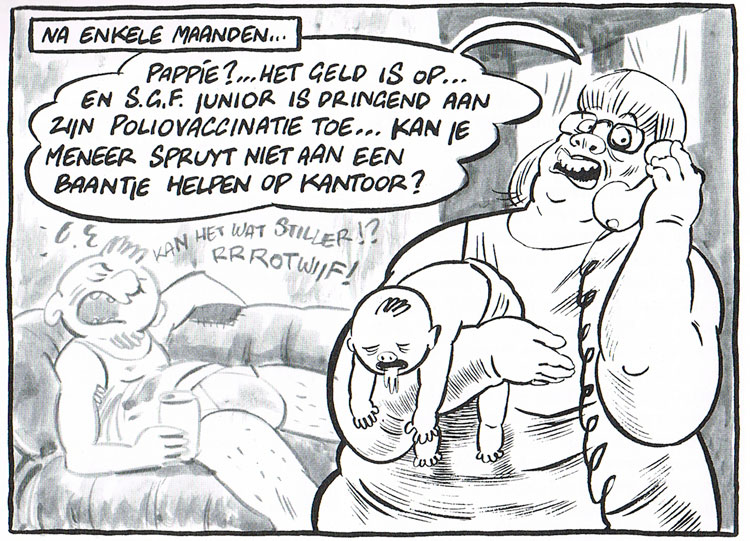 In 2008, Simon Spruyt won a comics contest organized by Focus Knack (the cultural supplement of Knack magazine), with his short story 'Productiecapaciteit'. A concept he had already begun as a student in Sint-Lukas, it offered a mocking look at the commercial comics industry, carrying as a subtitle "Een blik achter de schermen van Les Studios S.G.F. Spruyt" ("A behind-the-scenes look at Les Studios S.G.F. Spruyt"). The comic is a hilariously over-the-top satire of the comic industry, personified in the merciless publisher S.G.F. Spruyt. In the following years, Spruyt expanded and colorized the story into the full-length graphic novel 'SGF' (Silvester, 2010), of which chapters were serialized in Zone 5300.