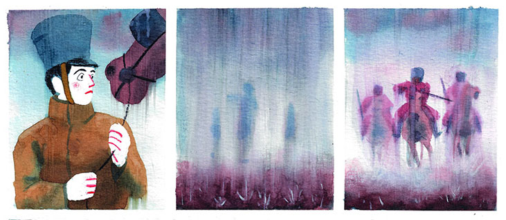 'De Tamboer van Borodino' (2021, in French: 'Le Tambour de la Moskova'), follows the drummer boy Vincent Bosse during Napoleon's ill-fated invasion of Russia. The sheer innocence of the naïve young boy is contrasted with the world-weary cynicism of his fellow soldiers and officers. His corporal is deliberately modelled after one of the criminals on the Hieronymus Bosch painting 'The Carrying of the Cross'. Spruyt uses atmospheric color schemes to evoke the foggy weather and fiery battle scenes.
