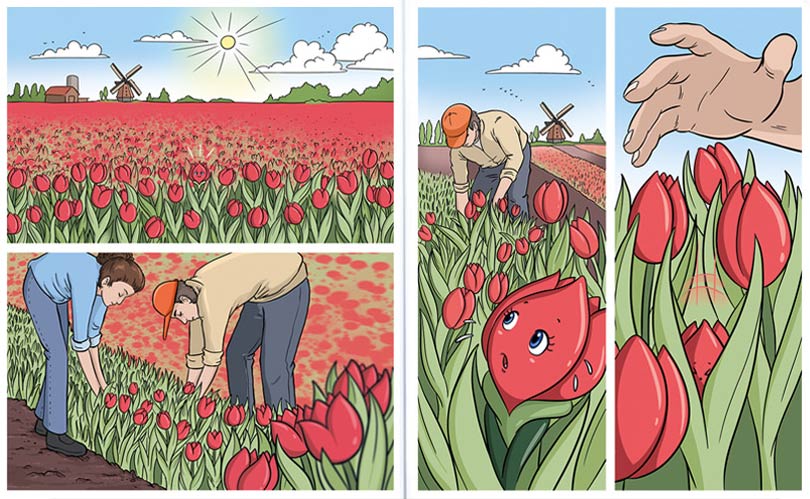 At Tekenteam, Van der Stadt worked as illustrator and project coordinator. Besides Okki, she has created artwork for amusement parks, children's books and organizations, finetuning her skills in several techniques and styles. Since 2017, Van der Stadt has worked solo as Studio Sabine, doing cartoons, illustrations, infographics and character designs. Her artworks have appeared in/on children's picture books, birth cards, coloring pictures and Jumbo game packaging, among other things. In 2017, Van der Stadt illustrated the wordless picture story 'Tilly Tulp' by Lotte Alders, telling the story of a little tulip who goes on an adventure. Among her other children's book illustrations are 'Bibi & Lulu - Het is Feest!' (Moon, 2020), written by media personality Patty Brard, and the book series 'Rutger, Thomas & Paco' (Kosmos, 2021- ) by the YouTube stars Thomas van Grinsven and Ruger Vink. The latter books also contain comic story segments, for which Erik Haverkort and Bas Schuddeboom are among the writers.