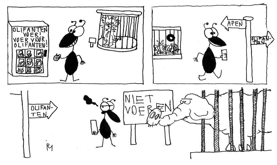 'Mier'. Translation: The ant buys elephant food, but the sign reads he is not allowed to feed the animals.