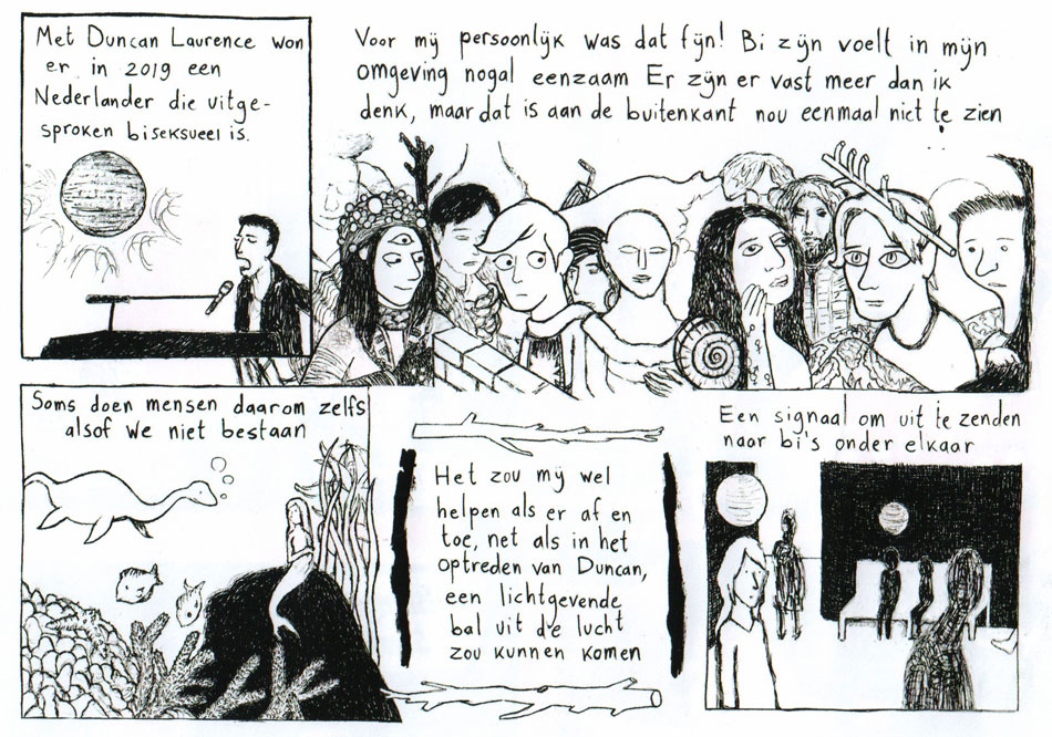 In 2020, she briefly returned to comics with a half-page contribution to Dolly Bellefleur and Margreet de Heer's 'SNGFSTVL & Strips', a special Songfestival issue of Personalia's Stripglossy magazine.