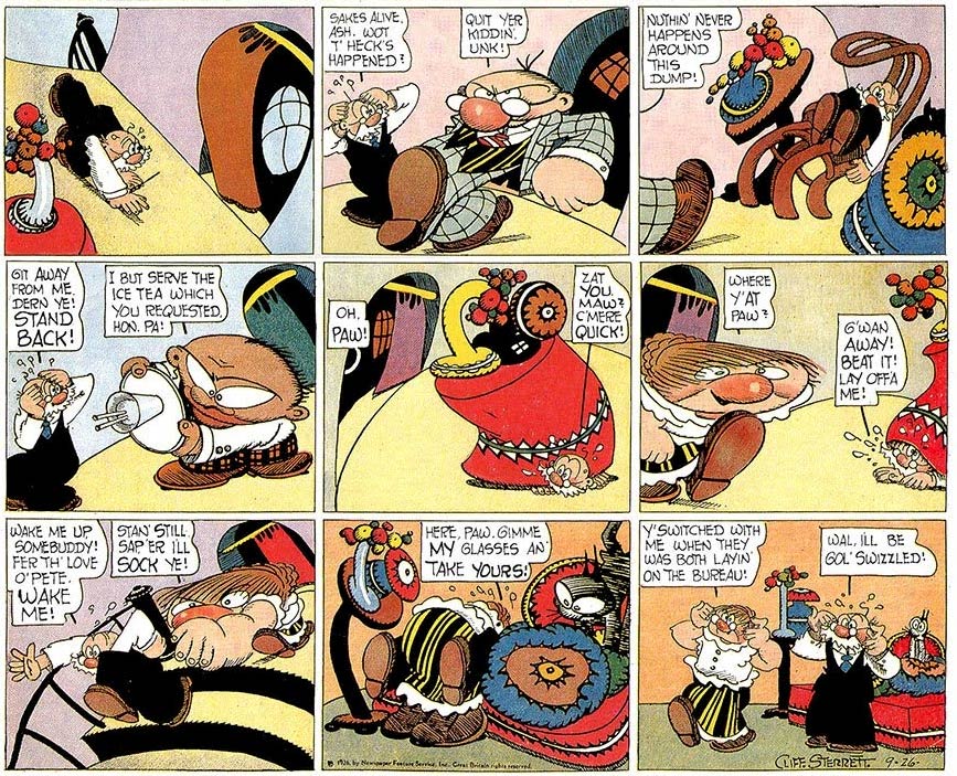 Cliff Sterrett is one of the great innovators of the comic page, and the creator of the long-running comic strip 'Polly and her Pals'. Born in Fergus Falls, Minnesota, Sterrett settled in New York at the age of 18 and attended courses at the Chase Arts School. Between 1904 and 1908, he worked for the New York Herald, drawing actuality illustrations and caricatures. From 1908 on, he was present in the New York Times, and later on in the Rochester Democrat and Chronicle.