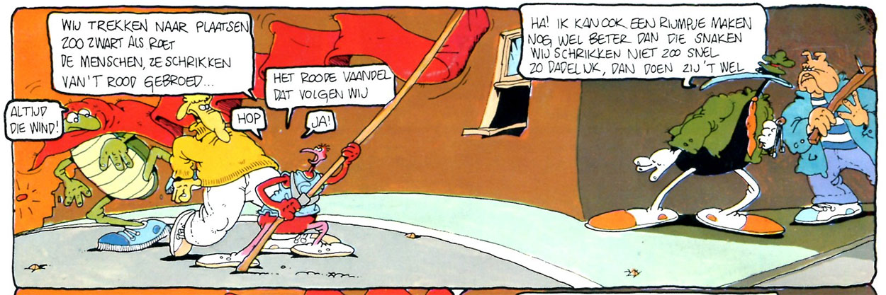 Around 1977, Stevenhagen and De Jager noticed an ad at the Rietveld Academy in which young comic creators were invited to join the alternative comic magazine De Vrije Balloen. Founded in 1975, the magazine was run by a group of professional comic artists, who used it as an outlet for their more adult and experimental comics. Among the original contributors were Patty Klein, Jan van Haasteren, Jan Steeman and Thé Tjong-Khing. Along with another newcomer, Eric Schreurs, the Prutswerk duo was part of a new generation that debuted in its pages. Over the course of five years, the Prutswerk team-up remained a regular fixture in the magazine, crafting a funny animal cast of characters, spearheaded by the bird sleuth 'Prut Pruts Private Kreye'. Between 1982 and 1984, De Vrije Balloen was rebooted at Espee under the title De Balloen, and Gerrit de Jager and Stevenhagen were on the editorial board, along with Aad Labadie and Bert Tier. When their professional collaboration ended, Stevenhagen remained involved in the final issues of De Balloen, while De Jager had already left.