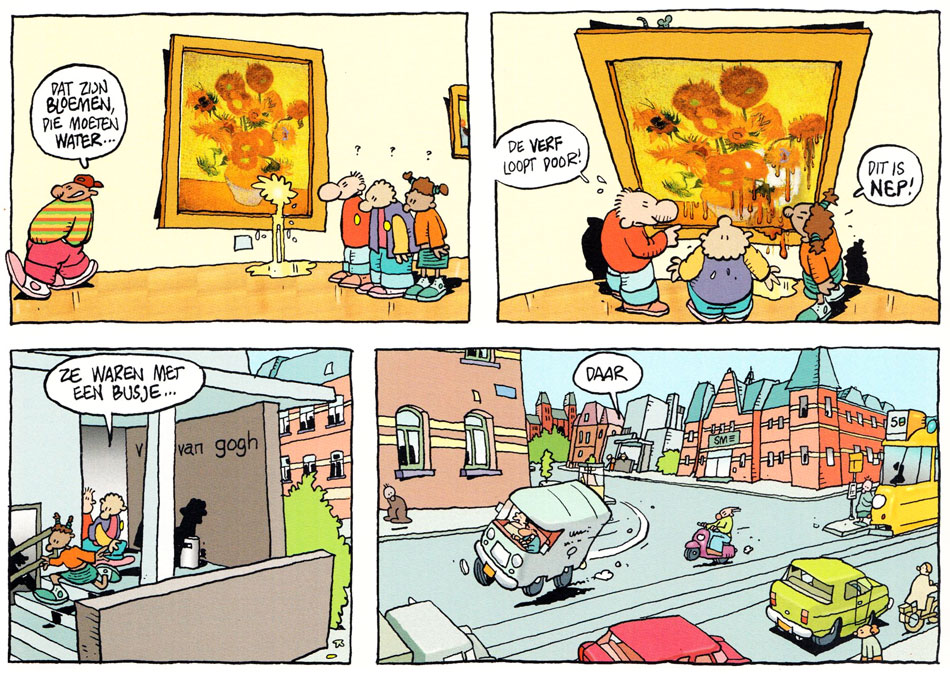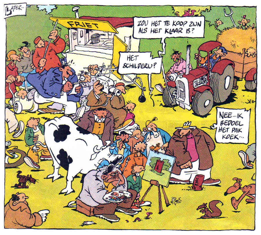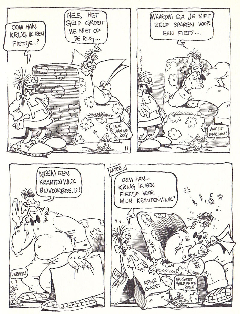While officially a Prutswerk production, the 'Han Gewetensvim' feature with its political satire was mostly Stevenhagen's story (the name Han Gewetensvim was even an anagram of Wim Stevenhagen). When Gummi magazine folded, 'Han Gewetensvim' was remodelled by Stevenhagen into 'Han en Hanneke', in which the main character appears with his little niece. This feature ran in Schooltv-Weekjournaal (1981-1983), a children's paper based on the educational TV broadcasts of 'Schooltelevisie', and daily in the newspaper De Waarheid (28 February-31 December 1983). The School-TV gags were collected in 'Ouwe Koeien' (Espee), while De Waarheid episodes were compiled in two 'Han en Hanneke' books by Espee. In 1985, the character of Han Gewetensvim returned in Onze Wereld, a magazine by Oxfam Novib about development aid.