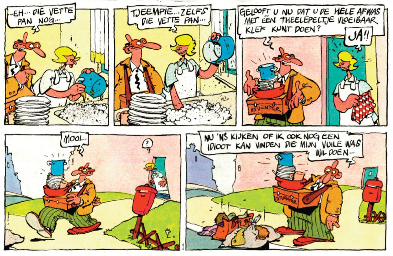 During the 1970s, Ger van Wulften distributed the French comic 'Les Frustrés' by Claire Bretécher to the men's magazine Nieuwe Revu. By 1979, it was time for a local replacement, and he introduced his artists Gerrit de Jager and Stevenhagen to the editors. The magazine wanted a raw humor comic with sex and social satire about a working-class family. Not one the reader could identify with, but one that would make them think: "I have neighbors like that." Working on this concept, Prutswerk came up with 'De Familie Doorzon' (1979-2010): its title a pun on the Dutch 1950s radio sitcom 'De Familie Doorsnee' about an "ordinary family", but also the term "doorzonwoning" to describe a typically Dutch home with windows on two sides, allowing the sun to shine all the way through. As can be expected, the dysfunctional Doorzon family lives in such a home, more specifically in the Labrador Street (a nod to Tintin's address) in the fictional town of Zulthoven.